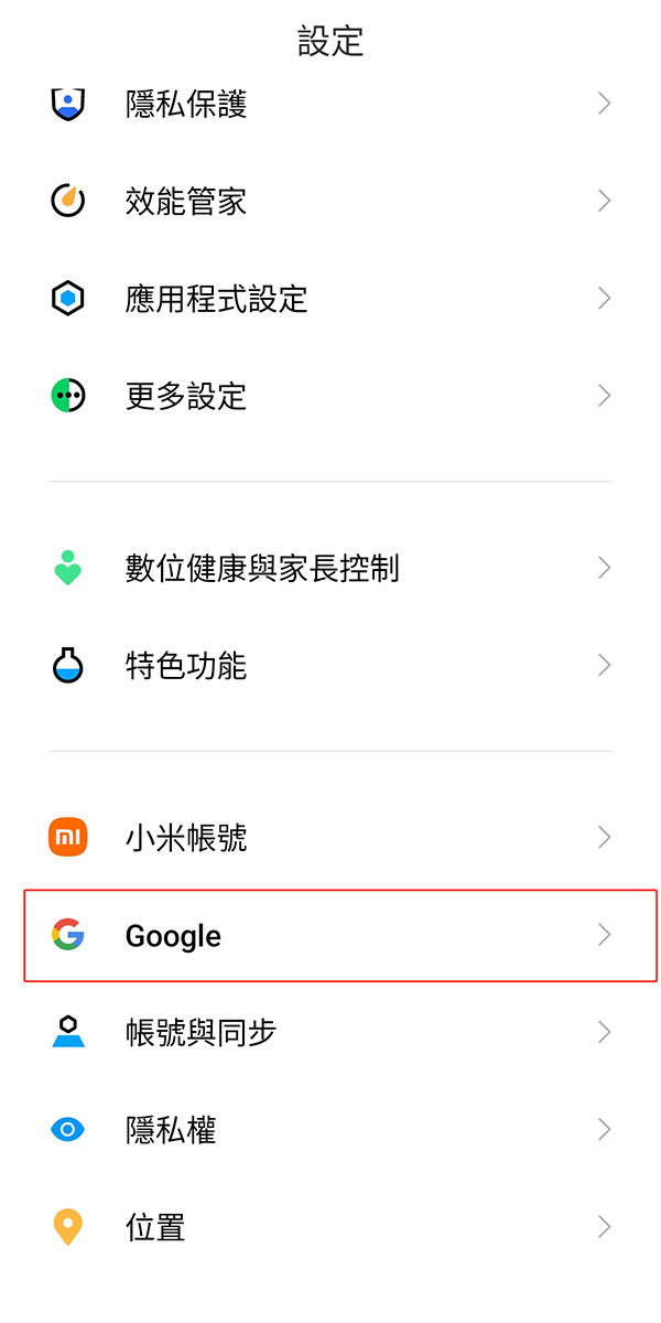 找到設定並選擇google