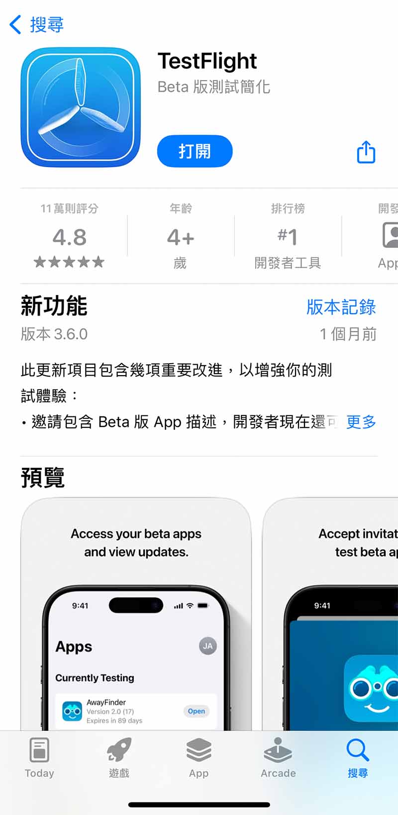 自動跳轉打開TestFlight,點擊【接受】後轉為【安裝】,即可安裝下載。